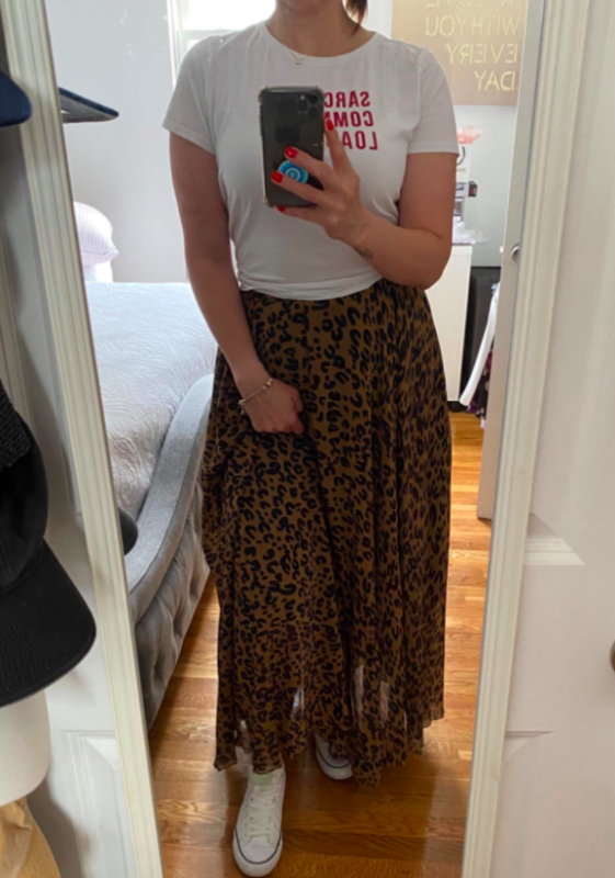 “So comfy! Hides the mom pooch and very flattering even for a curvy figure. Can be paired with a crop top or tucked-in top. Will be buying more skirts like this once we return to the office. A little long if you were to wear lower… but could be fixed with wedges or platforms”