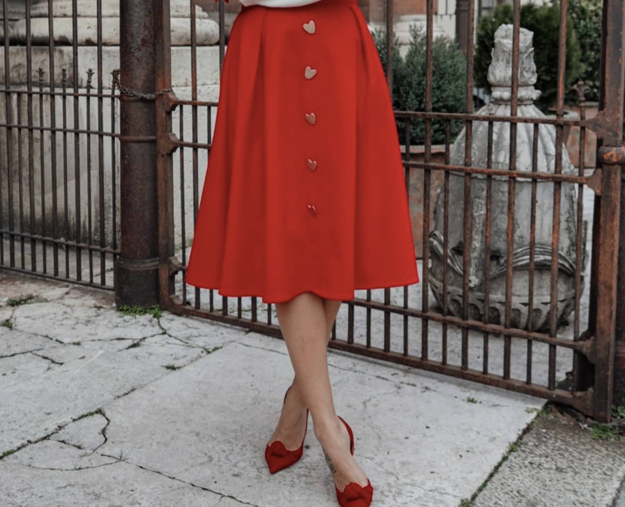 6. Heart Shape Button Embellished A-Line Midi Skirt, $53