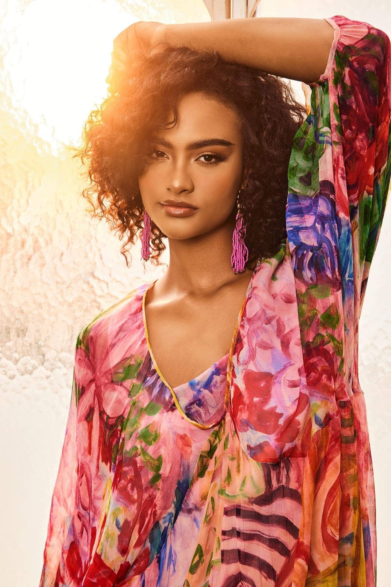 - V Neck Front & Back, Floral Print, Batwing Sleeve, Midi Length.